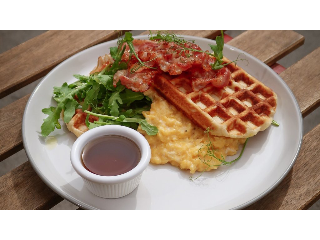míchaná vejce / javorový sirup / anglická slanina / rukola