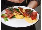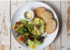 Vejce benedikt 2 ks (anglický muffin, pošírované vejce, holandská omáčka, salát s medovo-hořčičným dresingem)