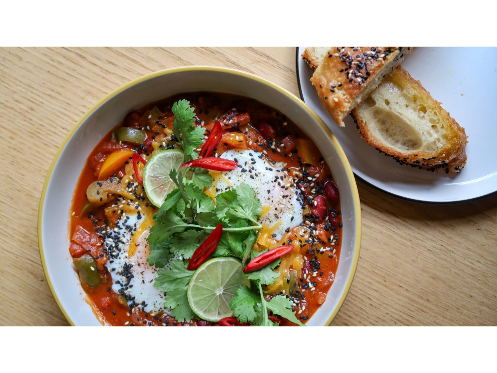 vejce 63 / cheddar / zeleninová směs s fazolemi / focaccia / koriandr / jarní cibulka / sezam 1,3,7,11,12