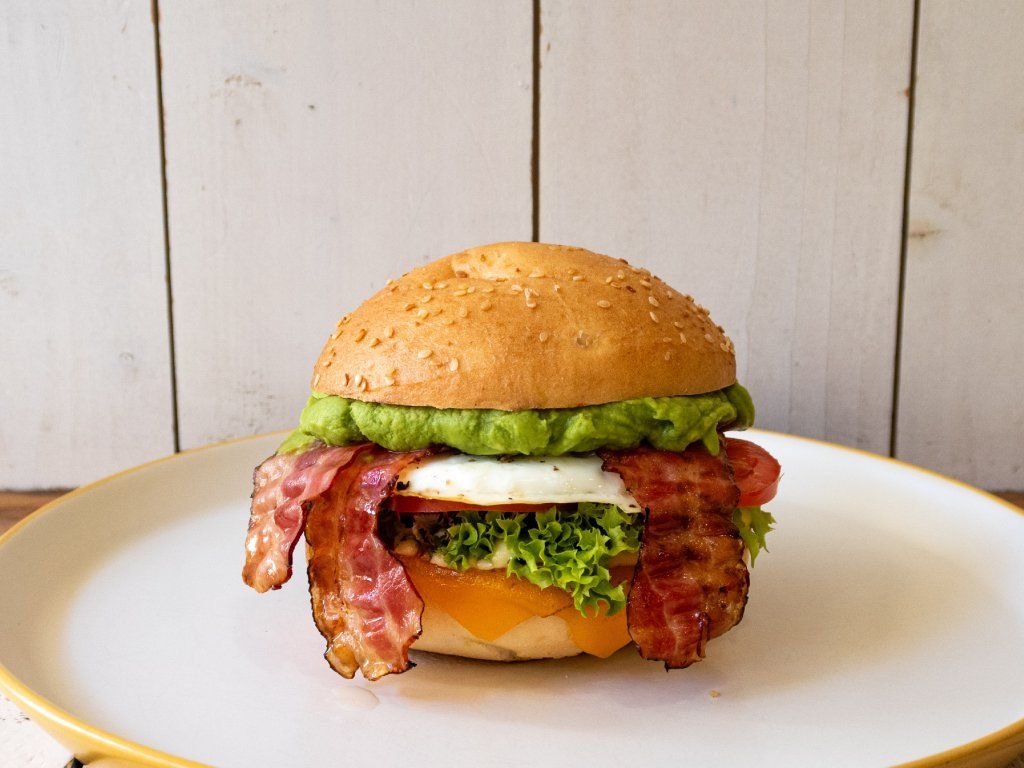 Anglická slanina / sázené vejce / cheddar / krémové avokádo / rajče / salát / dijonéza / bunska (pekařství Křižák)