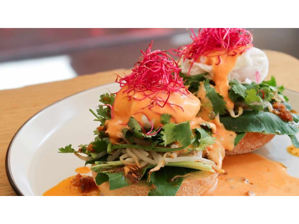 trhané kachní maso / holandská omáčka s uzenou paprikou / baby špenát / marinované červené zelí / pošírová vejce / anglický muffin / smažená cibulka / salát s praženými ořechy a medovo-hořčičným dresignem