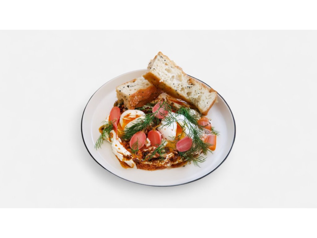 Bylinkový labneh / kořeněné máslo / topinamburové chipsy / ořechy / rajčata / cibulová focaccia / kopr