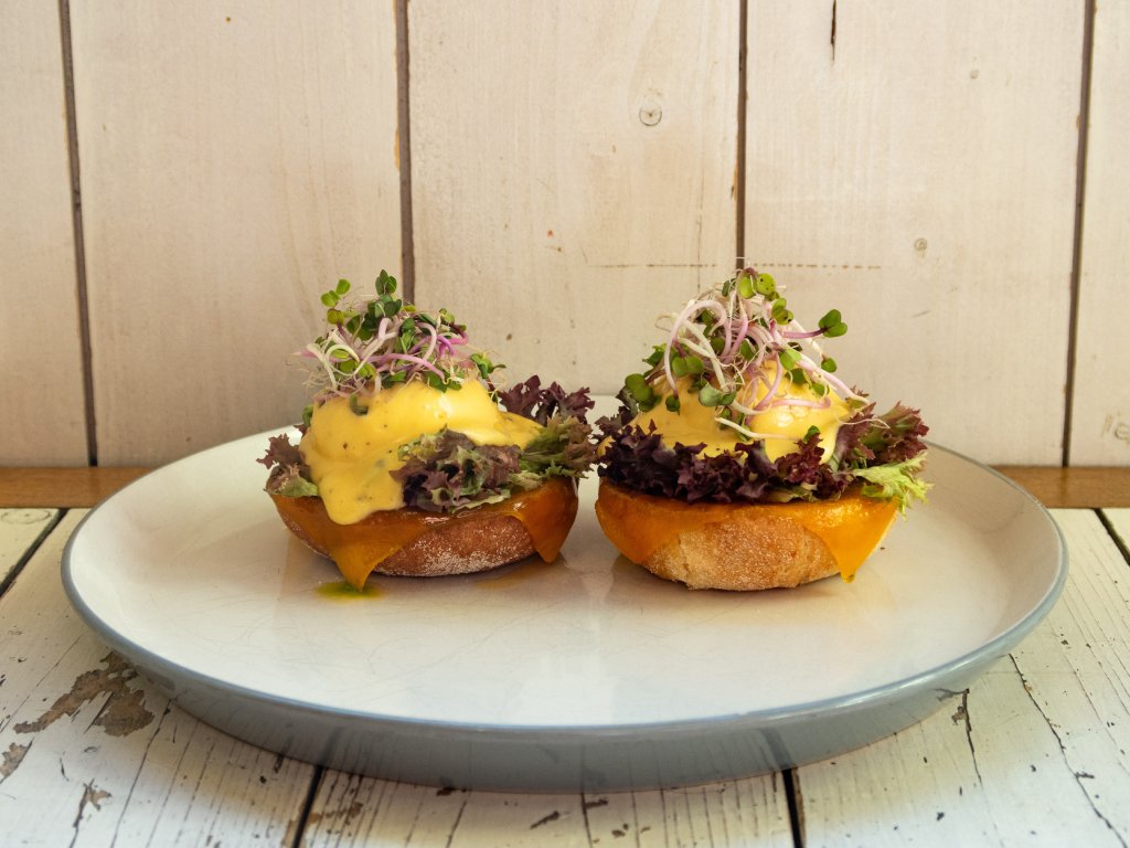 Náš anglický muffin / rukolové pesto / salát / pošírovaná vejce / holandská omáčka / microgreens